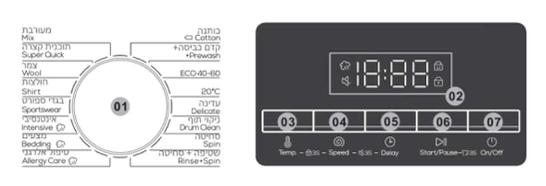 - תוכניות כביסה מגוונות כולל מהירה, עדינה, צמר, חולצות, מצעים ותוכנית לבעלי אלרגיה.